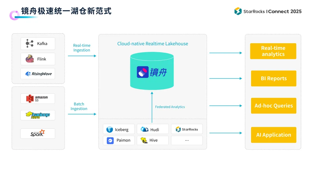 数据分析引擎的演进表明,湖仓一体正在成为未来趋势。这种架构能够统一存储、支持高性能查询,并原生支持 AI 应用。企业可以轻松摄取多源数据,无论是来自 Kafka、Flink 的实时流,还是 Spark、S3 的批量数据,都能在统一平台上进行处理和分析。