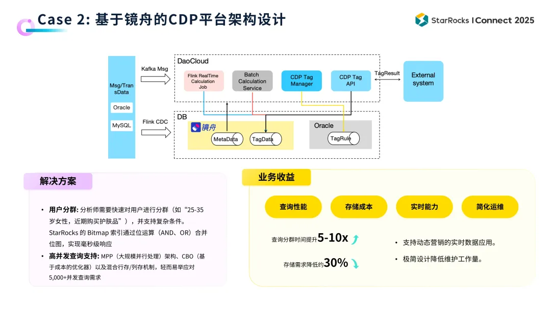 镜舟科技的解决方案通过变更数据捕获(CDC)机制实现实时数据流转,利用物化视图优化数据模型,支持客户管理、细分洞察、用户画像等多种应用场景。关键在于 StarRocks 的位图(Bitmap)功能和 MPP 架构,为高并发查询提供了强有力的支撑。