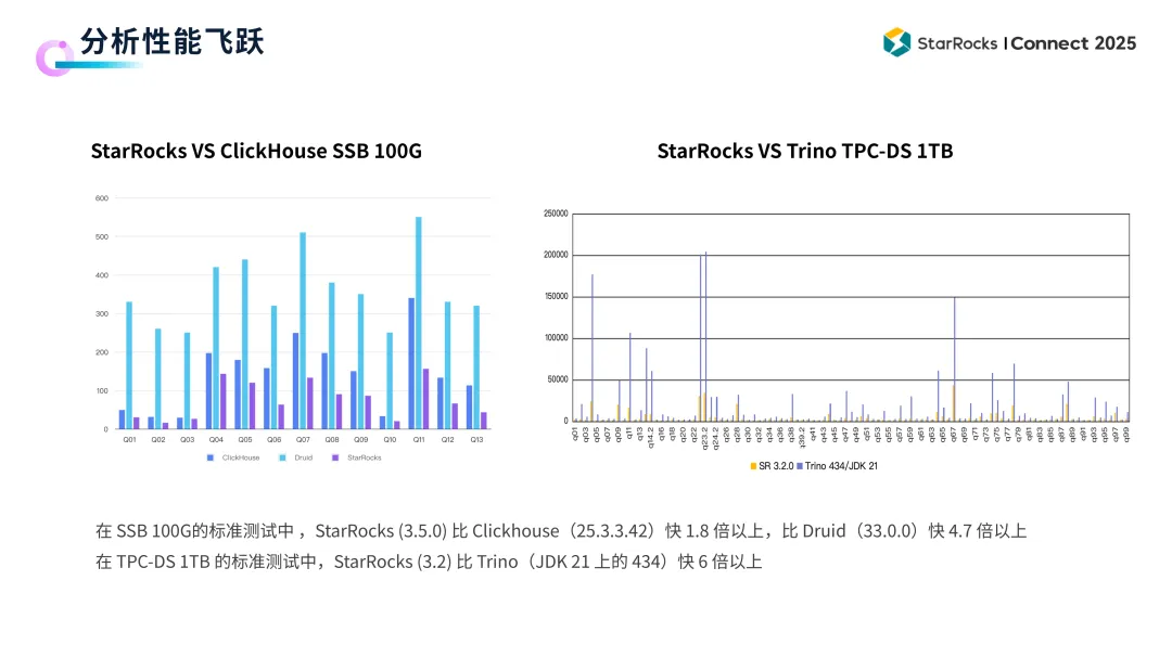 根据 SSB 和 TPC-DS 等基准测试,StarRocks 的查询速度比其他主流引擎快 2 倍以上,性能表现持续领先。但我们更关注的是,这种性能优势如何转化为客户的业务价值——更快的查询意味着更及时的决策,更低的成本意味着更高的投资回报。
